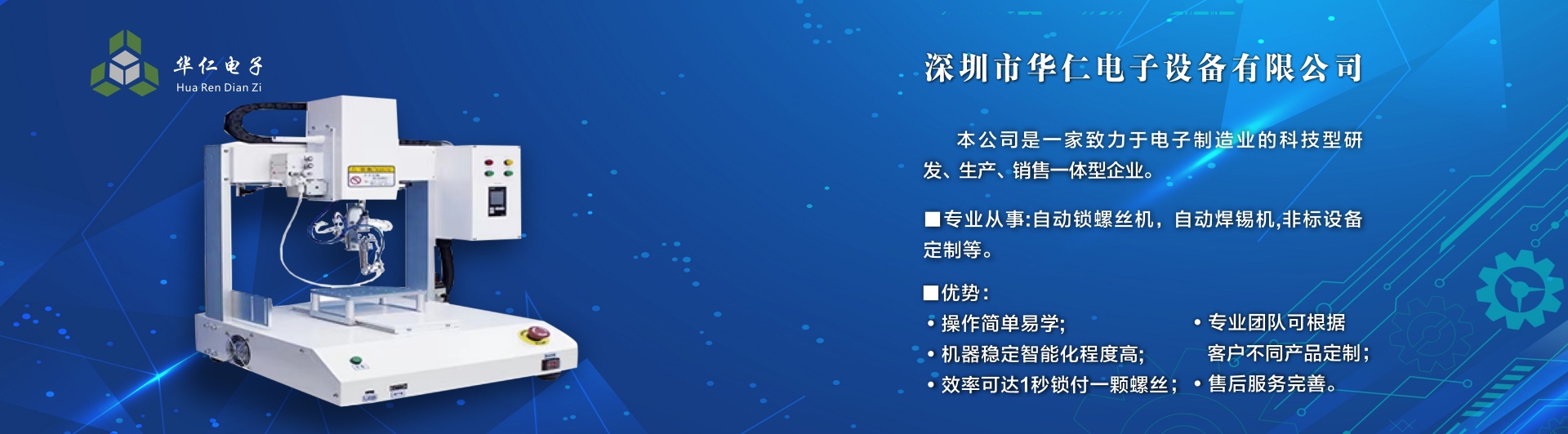 深圳市華仁電子設備有限公司是一家致力于電子制造業周邊設備的科技型研發、生產、銷售一體的企業,專業從事:自動鎖螺絲機;自動焊錫機;非標設備定制機等,公司長期以來在行業中積累了豐富的經驗,擁有專業的研發、技術、銷售支持工程團隊、各高級技術人才為客戶提供優質產品和服務,同時不斷吸取國內外先進技術,更準確及時地為客戶提供優質,性價比高的產品、公司以專業的售前、售中、售后服務贏得了客戶的信賴和好評,為客戶提供先進自動化設備一體式解決方案、